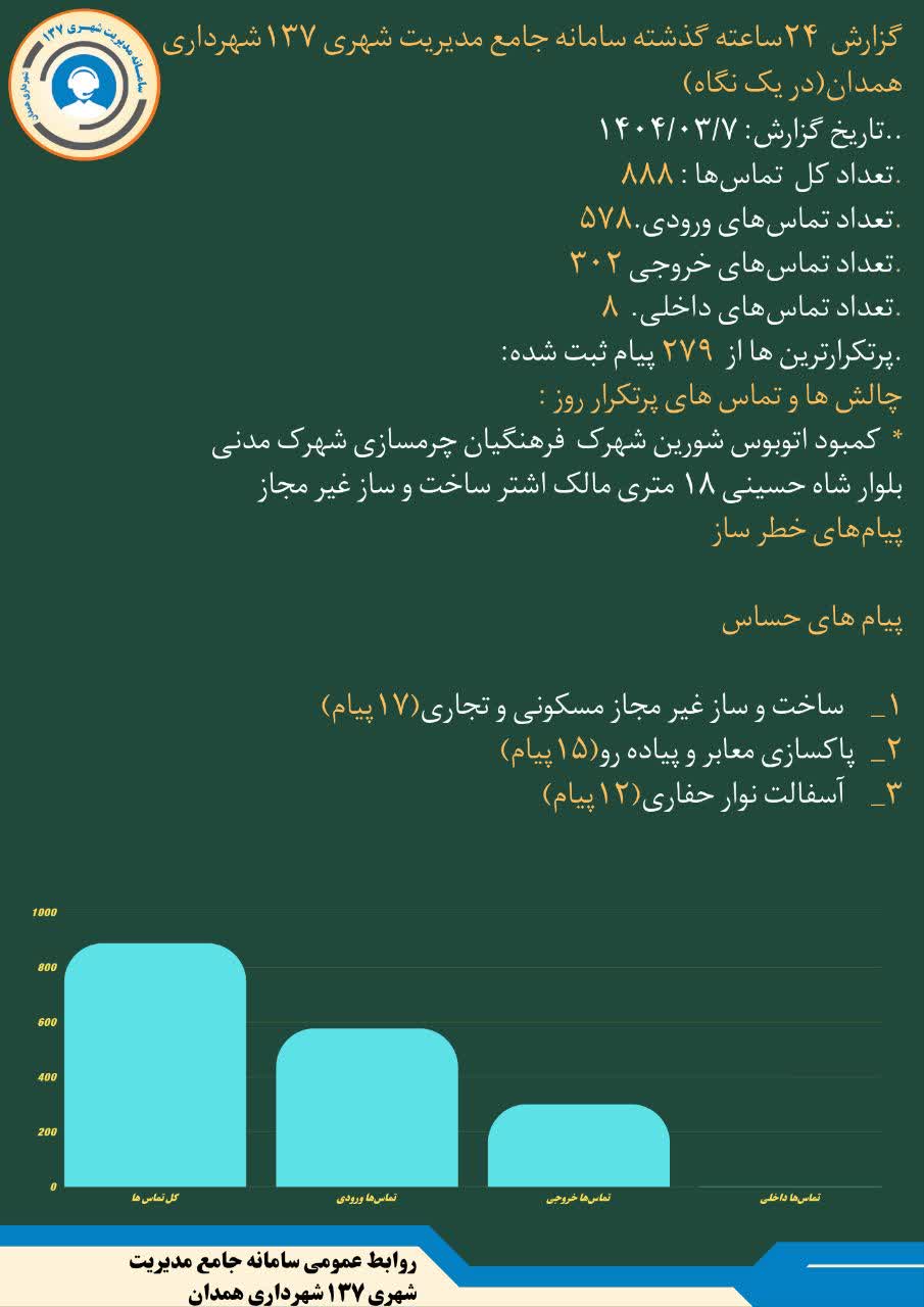 به گزارش فردای همدان، سامانه جامع مدیریت شهری ۱۳۷ شهرداری همدان امروز، ۸۸۸ تماسها داشت که از این رقم، تعداد تماسهای ورودی ۵۷۸، تعداد تماسهای خروجی ۳۰۲ و تعداد تماسهای داخلی هشت مورد بود.