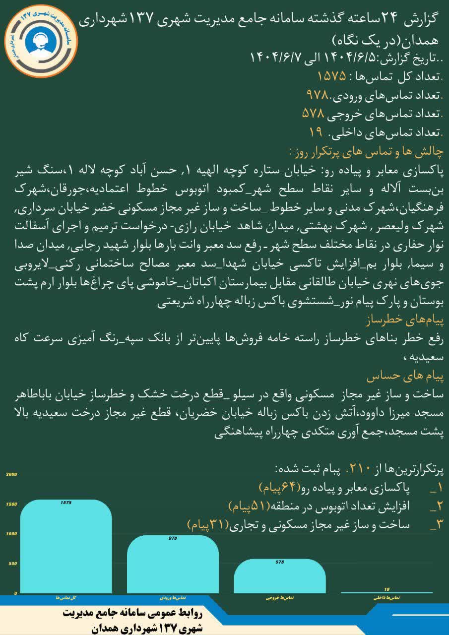 به گزارش فردای همدان، سامانه ارتباط مردمی ۱۳۷ در بازه زمانی ۵ تا ۷ شهریور ۱۴۰۴، با ثبت ۱۵۷۵ تماس، عملکرد قابل توجهی را در پاسخگویی به مطالبات شهروندان همدانی از خود نشان داد. از این تعداد، ۹۷۸ تماس ورودی، ۵۷۸ تماس خروجی و ۱۹ تماس داخلی به ثبت رسید که نشاندهنده تعامل فعال میان شهروندان و مدیریت شهری است.