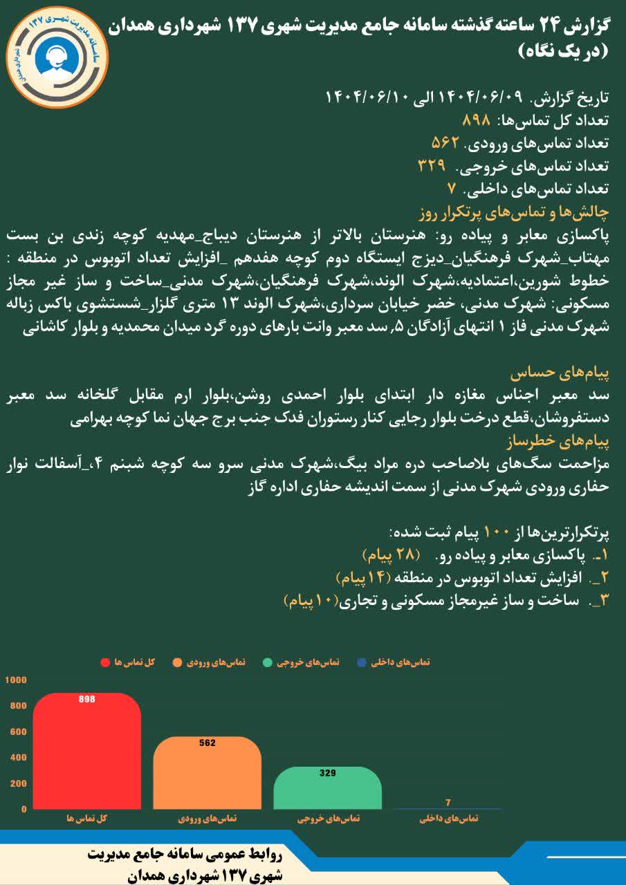 به گزارش فردای همدان، سامانه جامع مدیریت شهری شهرداری همدان در روزهای ۹ و ۱۰ شهریورماه، با ثبت ۸۹۸ تماس شامل ۵۶۲ تماس ورودی، ۳۲۹ تماس خروجی و ۷ تماس داخلی، به بررسی و پیگیری مسائل و دغدغههای شهروندان پرداخت. این حجم از ارتباطات نشاندهنده مشارکت فعال مردم در مدیریت شهری و اهمیت پاسخگویی به نیازهای روزمره آنان است.