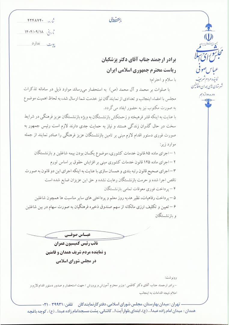 به گزارش فردای همدان، عباس صوفی، با تأکید بر شرایط سخت زندگی بازنشستگان، اجرای قوانین مرتبط با حقوق، بیمه، رتبهبندی و همسانسازی پرداختها را ضروری دانست و خواستار پرداخت سریع معوقات و رفاهیات فرهنگیان شد.