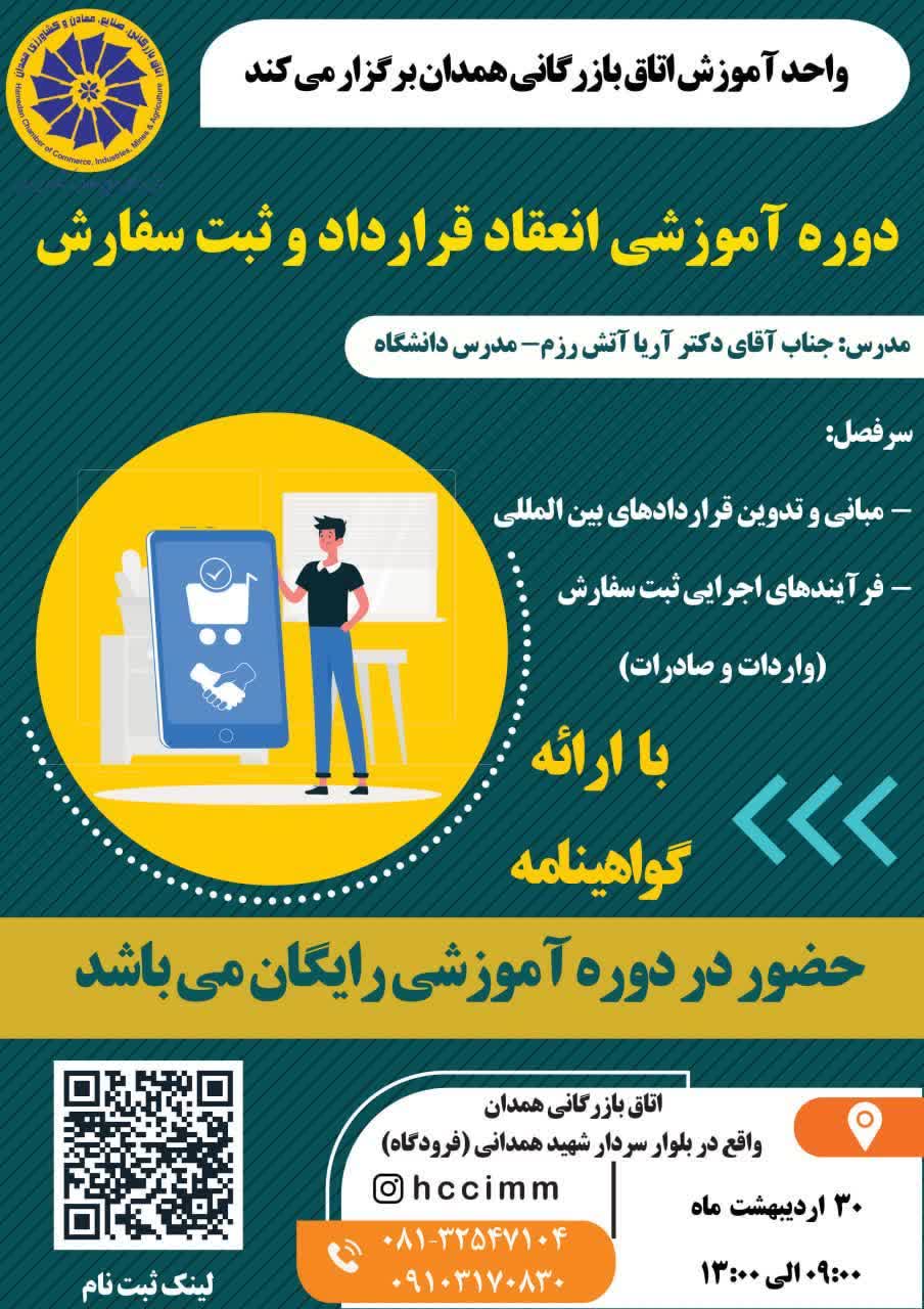 به گزارش فردای همدان، واحد آموزش اتاق بازرگانی همدان در راستای ارتقای دانش و مهارت فعالان حوزه تجارت، دوره آموزشی «انعقاد قرارداد و ثبت سفارش» را برگزار میکند. این دوره با تدریس جناب آقای دکتر آریا آتشرزم، مدرس دانشگاه، به بررسی مبانی و تدوین قراردادهای بینالمللی و فرآیندهای اجرایی ثبت سفارش در واردات و صادرات خواهد پرداخت.