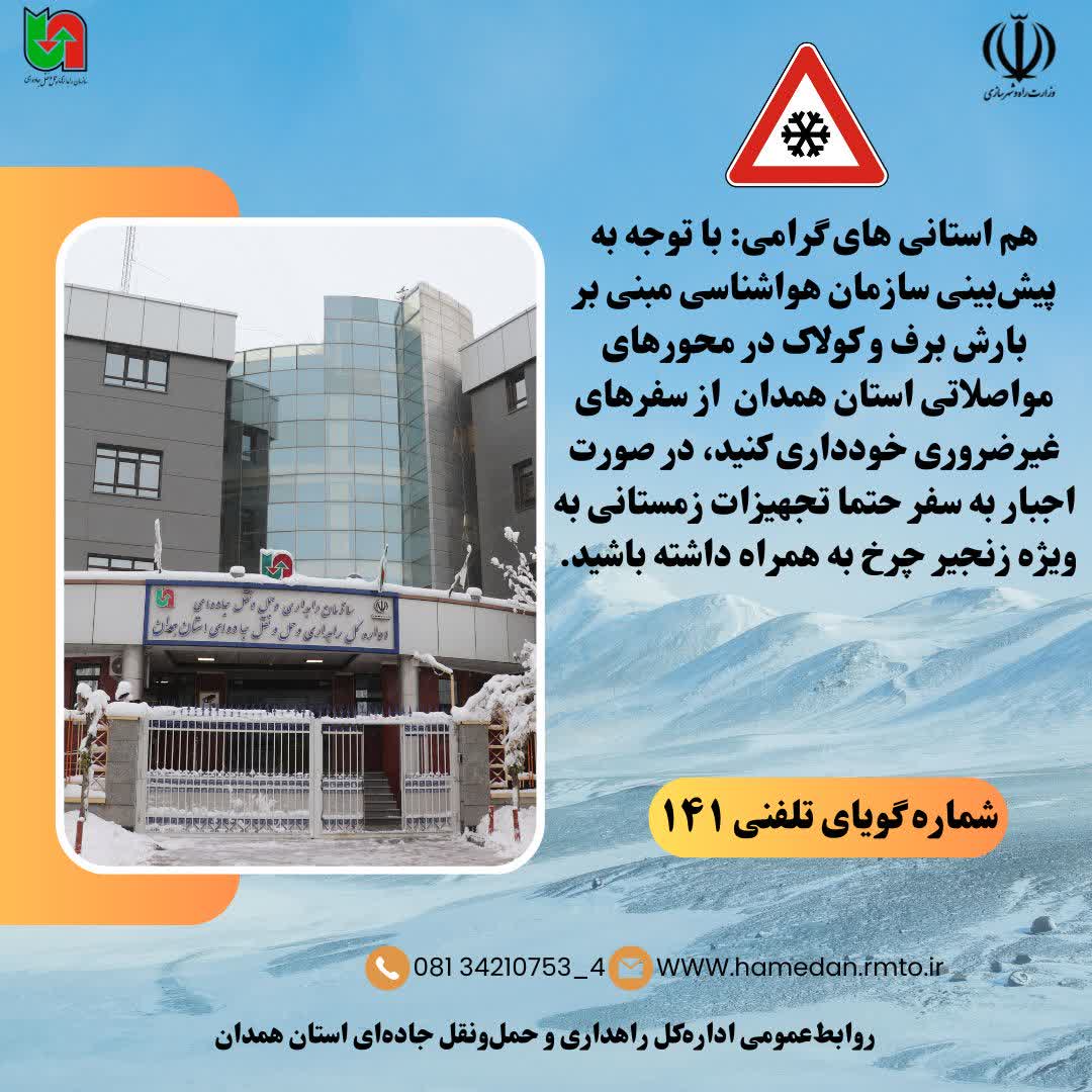 به گزارش فردای همدان، هم استانی های گرامی: با توجه به پیشبینی سازمان هواشناسی مبنی بر بارش برف همراه با کولاک طی روزهای آینده در محورهای مواصلاتی استان همدان به ویژه گردنهها و محورهای کوهستانی، از سفرهای غیرضروری خودداری کنید و در صورت اجبار به سفر حتما تجهیزات زمستانی به ویژه زنجیر چرخ به همراه داشته باشید.
